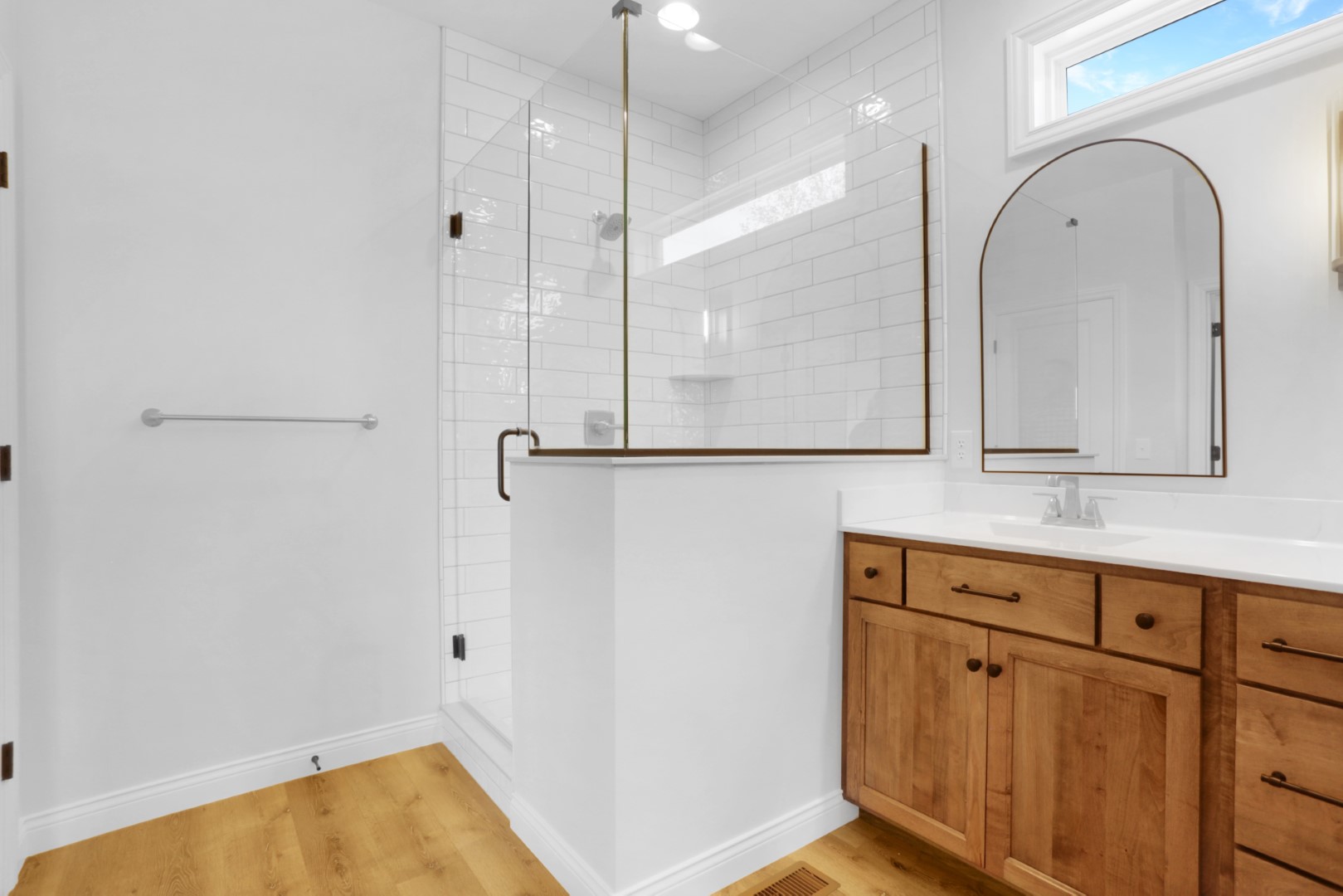 The open-concept living room, kitchen, and dining area are bathed in natural light, creating a warm and inviting atmosphere centered around a stunning fireplace. The master suite is a true retreat, featuring a beautifully designed bath with a dual vanity for added luxury.