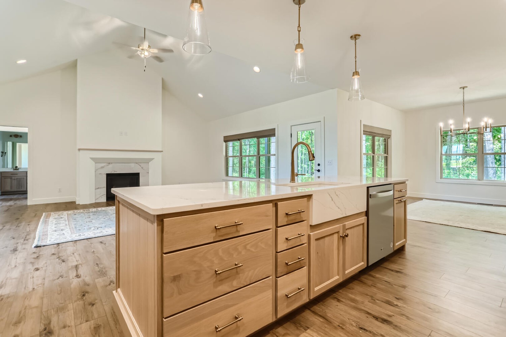 The open-concept living area is bright and inviting, with large windows that fill the space with natural light. A cozy fireplace anchors the room, creating a warm atmosphere perfect for relaxing or entertaining. The modern kitchen, complete with generous counter space and ample storage, flows seamlessly into the living and dining areas, making it easy to stay connected while cooking or hosting.